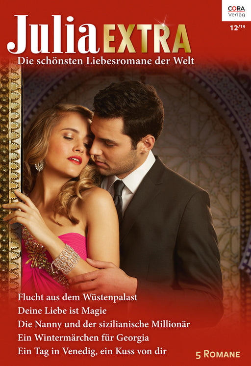 FLUCHT AUS DEM WÜSTENPALAST von KENDRICK, SHARONWüstenprinzessin Leila führt ein Leben im goldenen Käfig. Doch an Flucht wagt die begeisterte Fotografin nicht zu denken … bis Werbe-Tycoon Steel als Gast des Sultans im Palast auftaucht. Aber ist der attraktive Playboy wirklich nur der Schlüssel zu ihrer Freiheit?DEINE LIEBE IST MAGIE von CREWS, CAITLINEin pikanter Auftrag! Adriana soll den für seine Affären berüchtigten Prinz Pato aus den Schlagzeilen halten - mehr nicht! Doch gegen jede Vernunft fühlt auch sie sich magisch von dem rebellischen Royal angezogen …DIE NANNY UND DER SIZILIANISCHE MILLIONÄR von MONROE, LUCYEine viertel Million für die Nanny? So verrückt kann auch nur Audreys Firmenchef Vincenzo sein. Da das Studium ihres Bruders viel Geld verschlingt und ihr Boss sie nicht persönlich kennt, bewirbt sie sich. Was sie nicht weiß: Er will auch ihre Liebe kaufen …EIN WINTERMÄRCHEN FÜR GEORGIA von GEORGE, CATHERINESeelenzustand: Liebeskummer! Für Georgia Grund genug, im Cottage ihrer Eltern Weihnachten zu feiern - und zwar allein. Doch als das Wetter umschlägt, steht plötzlich Chance vor der Tür, um sie zu retten. Dumm, denn der charmante Draufgänger ist der Bruder ihres Ex …EIN TAG IN VENEDIG, EIN KUSS VON DIR von PORTER, JANEWer ist der Fremde, der ihr Herz zum Rasen bringt? Als Diane ihren totgeglaubten Mann Domenico in Venedig wiedertrifft, ist das ein Schock. Denn er gehört einer anderen Frau … Aber warum küsst er Diane so, als würde er sie noch immer lieben?